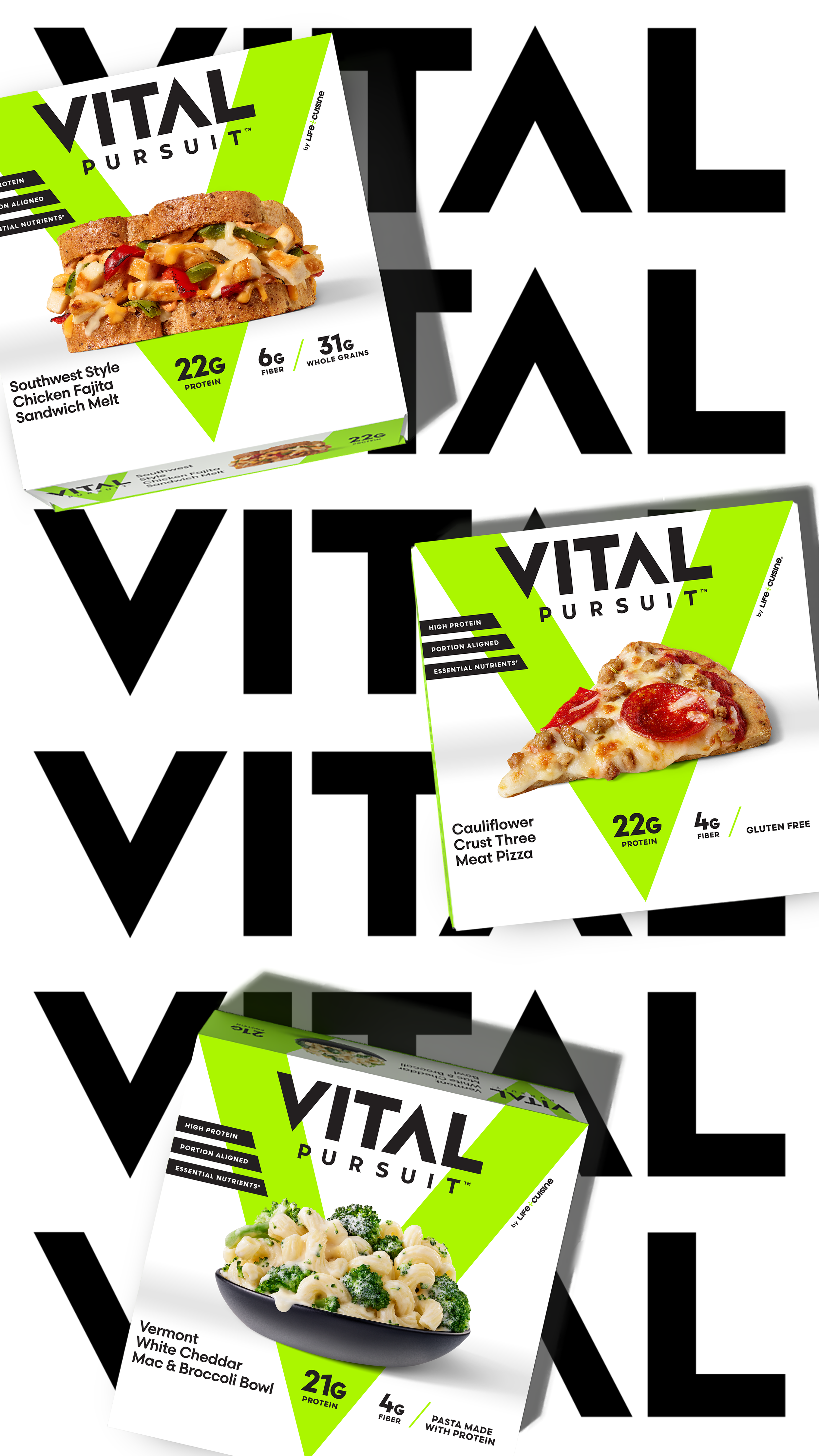 Vital Pursuit is a completely new Nestlé brand created to address the nutritional needs of the GLP-1 Consumer. The identity and packaging design system was crafted to dramatically shake up the visual language of the category and promise the consumer the deliciousness they crave, with the power of the essential nutrients they need, on their journey to healthier living.